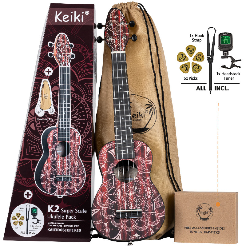 A K2SS ukulelék kék, narancssárga és piros kaleidoszkóp felülettel kaphatók.
